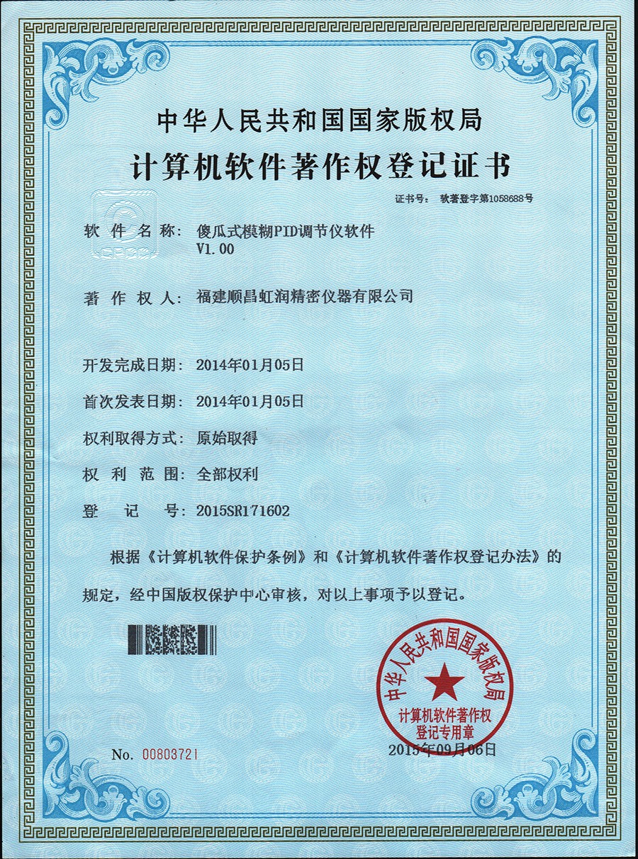 | 人工智能模糊PID調(diào)節(jié)器 軟件登記證書 | 傻瓜式模糊PID調(diào)節(jié)儀 軟件登記證書 |
