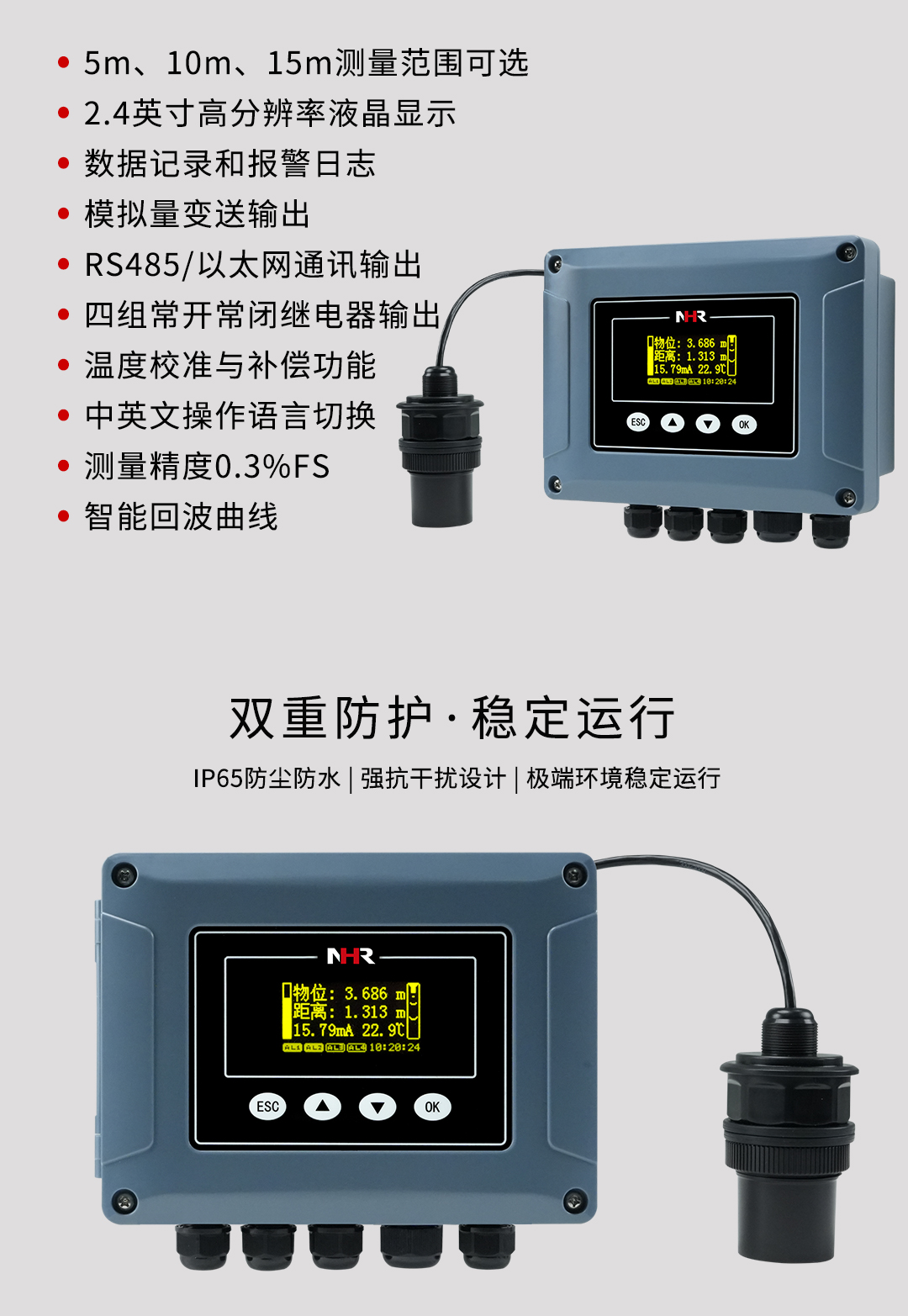 NHR - LC11 系列分體式超聲波液位計,是一款功能全面且便捷實用的液位 / 物位測量儀器。它具備數據記錄與報警日志功能,安裝與維護都極為簡便。該液位計采用非接觸式測量,無需與介質直接接觸,就能精準滿足大多數液位 / 物位的測量需求。